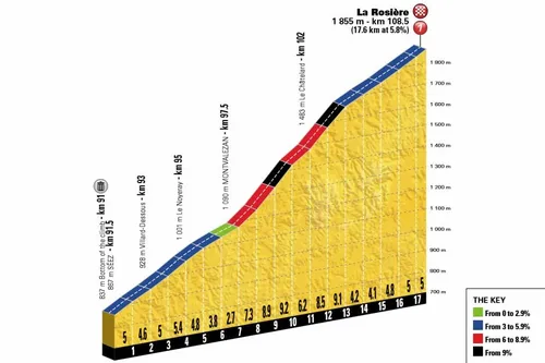 Het is geen moment vlak, dus rijden de renners na een korte afdaling en een kleine vallei waar het ook omhoog gaat, door naar de Cormet de Roselend. Dit is een klim van tweede categorie, maar dat komt vooral door de lengte van vijf kilometer. De acht procent stijging zal pijn doen, vooral na de steile slotkilometers van de Col du Pré. Na een lange, technische afdaling naar Bourg-Saint-Maurice staat de slotklim te wachten. 17,6 lange kilometers naar La Rosière gaan uitmaken wie het sterkst is. Gemiddeld is de klim 5,8 procent, maar middenin zitten stukken van boven de negen procent. Of wordt de schifting al eerder gemaakt, aangezien er regen wordt voorspeld op de technische afdaling van de Cormet de Roselend?