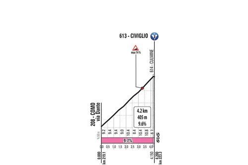 Na de top is het even herpakken en op adem komen. Eerst volgt een afdaling van dertien kilometer en dan is het 15 kilometer vlak richting de slotklim: de Civiglio. Kort, maar daarom niet minder krachtig. 4200 meter lang gaat het aan gemiddeld 9.6%, en maximaal 14%, omhoog en is daarmee een reuzendoder. Een slechte dag en je staat geparkeerd, een goede dag en je kan je concurrenten een enorme klap toedienen. Als je je voorsprong tenminste houdt in de 9 kilometer lange afdaling naar de streep.