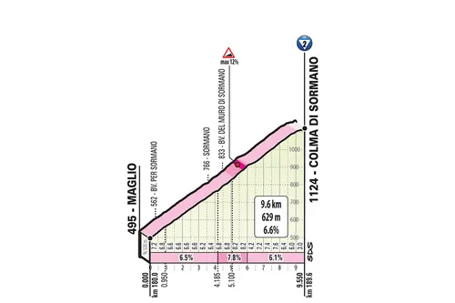 Dan is de beer los, want na een korte afdaling ligt daar meteen de Colma di Sormano, de langste klim van de dag met zijn 9600 meter. De moeilijkheidsgraad ligt wel iets lager, de klim is een echte loper, die gedurende de eerste vijf kilometer een hellingsgraad kent van 6 a 7 procent, dan een kilometer naar 8 procent gaat en daarna weer terugkeert naar de 6 a 7. Halverwege ligt een kleine piek van 12% en in de laatste 500 meter vlakt het af.