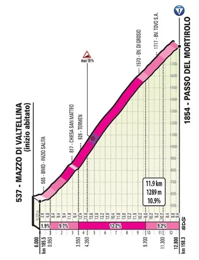 De Mortirolo die in het parcours is opgenomen kennen we nog van de laatste jaren. Zowel in 2015 als in 2017 werd deze aangedaan in de zestiende etappe van de Giro. In 2017 won Vincenzo Nibali de rit naar Bormio en in 2015 was Mikel Landa de gelukkige, toen hij Steven Kruijswijk en Alberto Contador achter zich liet. Fun fact: Kruijswijk was die dag wel als eerste boven op de Mortirolo.