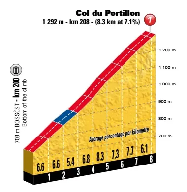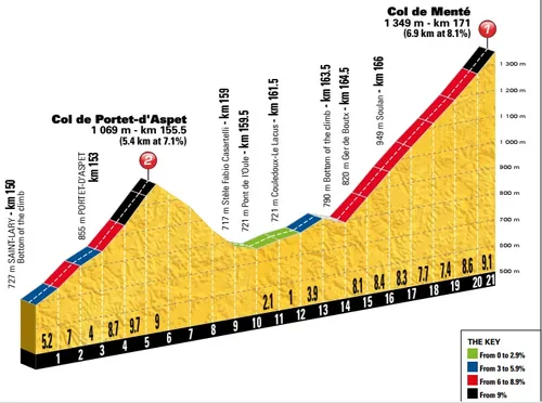Toch zal aanvallen op de Col de Menté ook afschrikken als wordt gekeken naar de vallei die nog volgt. Na de afdaling volgt er een stuk van twintig kilometer richting de voet van de Col du Portillon. Wat vooruitgestuurde ploeggenoten zouden een hoop kunnen helpen. De Col du Portillon is op papier iets makkelijker dan de Col de Menté. De klim is 8,3 kilometer lang en stijgt gemiddeld met 7,1%. Vanaf de top van de Col du Portillon, op de grens tussen Frankrijk en Spanje, is het nog tien kilometer dalen richting de finish, alleen de laatste kilometer is nog vlak. In die laatste 1000 meter zitten overigens wel drie scherpe bochten. Op 200 meter van de finish ligt de laatste bocht.