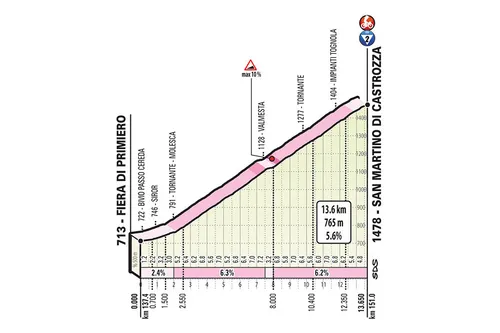 Na een langlopende afdaling en een stuk Italiaans vlak volgt de eenvoudige klim naar Lamon waarna we ons op kunnen maken voor het sluitstuk van de dag. 13,6 kilometer lang met een eenvoudige eerste twee kilometer. De resterende kilometers kennen een gemiddeld stijgingspercentage van net boven de 6%. In de laatste 400 meter vlakt het nog wat meer af als er gesprint kan worden voor de ritzege of een eenling de handen in de lucht kan steken.