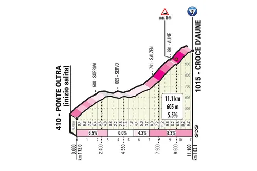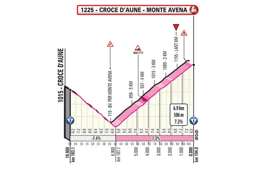 Wat volgt is een afdaling van maar liefst 39 kilometer, al is vooral de eerste 22 steil naar beneden. Eenmaal beneden volgt de ultieme finale met de beklimming van de Croce d’Aune en de Monte Avena. De Croce d’Aune is ruim 11 kilometer lang aan gemiddeld 5.5%, maar dat komt vooral door het middengedeelte. De laatste vier kilometer van deze klim zijn loodzwaar aan gemiddeld 8.3%, maar ook stukken van meer dan 10% en zelfs 16%.