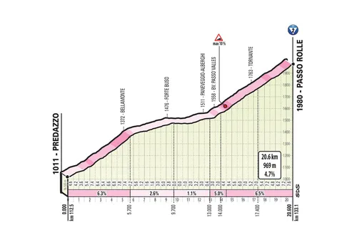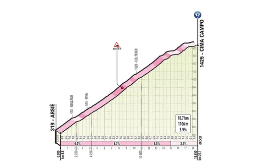 De Giro-organisatie wil eruit met een knal en dat belooft goed te gaan komen met deze loodzware rit van Feltre naar de top van de Monte Avena. 194 kilometer lang, dwars door de Alpen én de Dolomieten en met meer dan 5000 hoogtemeters. Vrijwel direct vanuit de start is het klimmen geblazen op de Cima Campo. Er is slechts 8.5 kilometer vlak om op te warmen. De Cima Campo is een lekkere binnenkomer, want deze is meteen 18.7 kilometer lang. Gelukkig voor de renners is het een redelijke loper en met zijn gemiddelde 5.9% stijgingspercentage niet al te lastig. De eerste 15 kilometer is 6% of meer, daarna vlakt het af.