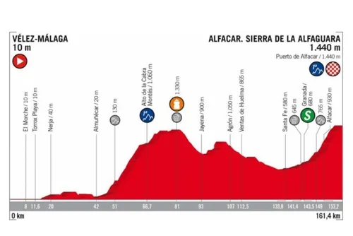 De etappe voert van Velez-Malaga naar La Alfaguara, een rit van 161.4 kilometer, met daarin twee serieuze beklimmingen. De eerste vijftig kilometer is vlak, maar daarna moet begonnen worden aan de Alto de la Cabra Montes, een klim van 16 kilometer lang, met maximale percentages aan bijna 9 procent. Gemiddeld genomen is het te doen met 5.2% gemiddeld. Daarna blijft het nog even stijgen, waarna het daarna met wat ups en downs zo’n 65 kilometer is naar de voet van de slotklim.