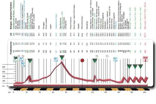 Giro dell'Emilia over dezelfde wegen en dat is in 2019 niet anders. In totaal koersen we 209 kilometer, op en af. In de finale liggen drie lokale rondjes te wachten en we eindigen heuvelop. Vanuit de start is het niet lang tot de Mongardino, de eerste klim van de dag. Deze klim is slechts 2,2 kilometer een voorproefje voor een echte col die erop volgt. De Passo Brasimone is onregelmatig en 19,6 kilometer lang.