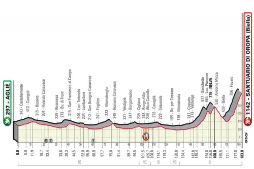 Wat volgt is een afdaling, waarna aan de slotklim naar het Santuario di Oropa geklommen gaat worden. Oropa? Juist ja, de wedstrijd eindigt op de klim waarop Tom Dumoulin in 2017 zegevierde in zijn roze trui tijdens de Giro d’Italia. Een hoop mooie herinneringen dus aan deze klim van 10.6 kilometer aan 6.6%.