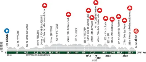 De vrouwen moeten net als in de Waalse Pijl vroeg uit de veren. Was het woensdag nog starten om 08.30 uur, komende zondag klinkt het startschot om 08.50 uur in Bastenaken. In totaal moet er 140,9 kilometer worden afgelegd. De eerste gecategoriseerde klim volgt na 53,1 kilometer en daarna is het klimmen en dalen tot aan de meet in Luik. In totaal liggen er zeven gecategoriseerde beklimmingen klaar, met de top van de laatste klim op 13,3 kilometer van de meet.