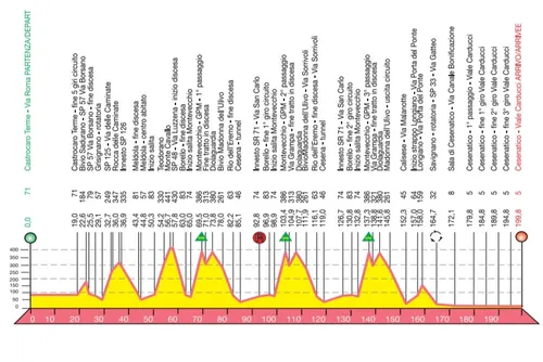 Mochten de sterke renners de sprinters willen lozen, dan zal in dit gedeelte het verschil gemaakt moeten worden. Zeker de drievoudige beklimming van de Montevecchio leent zich uitstekend voor wat krachtpatserij, want met 4,3 kilometer aan 7 prcocent is dit absoluut een pittig obstakel te noemen. Nadat de heuvelzone erop zit, resteren er nog een kleine vijftig kilometer waarin de sprintersploegen situaties kunnen herstellen. De uiteindelijke aankomst vindt plaats in de vroegere startplaats Cesenatico, waar na het meermaals afleggen van een lokaal circuit de winnaar uiteindelijk de handen ten hemel mag heffen.