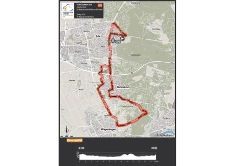 Kritiek dus op het parcours, maar waarom? Nou, volgens veel renners uit de buurt had het selectiever gekund, met minder brede snelwegen en meer heuveltjes. Daar is nu niet voor gekozen. In totaal worden er 223,4 kilometers afgelegd, negen rondes van 25,2 kilometer om precies te zijn. Deze rond start bij het gemeentehuis in Ede en via Bennekom en Wageningen vinden we de eerste hoogtemeters. Op de Wageningse Berg kunnen de mannen zonder snelle benen hun slag slaan.