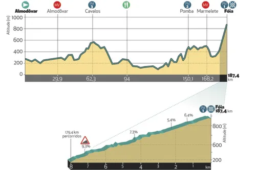 In de tweede etappe gaat het klassement meteen op zijn kop met aankomst bergop in Foia. Het maximale stijgingspercentage van deze onregelmatige klim van acht kilometer ligt net onder de tien procent. Renners die hier niet in orde zijn, gaan zeker veel tijd verliezen. Misschien gaat het zelfs al eerder ontploffen met een klim van tweede categorie op 37 kilometer van de meet.