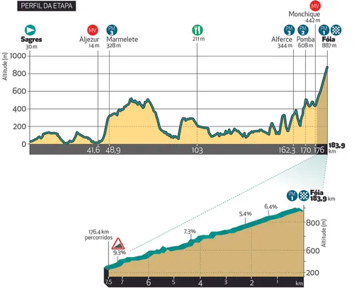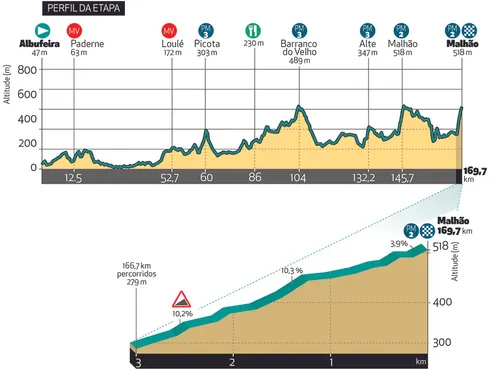 169,7 km: Alto do Malhão, 2e categorie (2,6 km aan 9,4%)