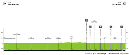 Scheldeprijs het best omschrijven. De wedstrijd begint precies op zeeniveau in Terneuzen, terwijl het hoogste punt dat bereikt wordt maar liefst 22 meter boven zeeniveau is. De Broekstraat kan nog voor enige reuring zorgen, een klinkerstrook die viermaal bedwongen moet worden in de plaatselijke ronde.