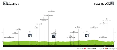 UAE Tour niet met een ploegentijdrit, maar met een vlakke etappe. Het parcours begeeft zich in en rond Dubai en is alvast een eerste kans voor de sprinters om de dagzege en leiderstrui te pakken. Wel moeten de sprinters waakzaam zijn, want er bestaat in de stukken door de woestijn altijd een kans op waaiers.