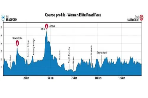Het vrouwenpeloton start in Bradford aan hun 149,5 kilometer durende zoektocht naar de wereldtitel. Vanuit de stad die bekend staat om haar wolverwerking reist de kudde richting het noorden van Yorkshire, voordat zij aankomen op het lokale circuit rondom Harrogate.