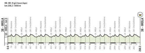 Over de tweede klim kan nagenoeg hetzelfde worden verteld. De Cima Galisterna begint met drie, vier procent makkelijk, maar na een kilometer begint een stuk van 1,3 kilometer aan 10,9 procent, met een maximale piek van veertien procent. Daarna zijn de laatste zevenhonderd meter van de klim nog licht hellend. Vanaf de top is het vervolgens een kleine twaalf, vooral dalende, kilometer naar de streep op het racecircuit van Imola.