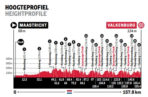 De lokale ronde met de Geulhemmerberg, Bemelerberg en Cauberg zal daarin vermoedelijk wel weer cruciaal zijn. Met nog honderd kilometer voor de boeg komen achtereenvolgens de Kruisberg, Keutenberg, Fromberg en Eyserbosweg, waarna de vier lokale rondes met daarin de eerder genoemde hellingen volgen. De laatste Cauberg moet op 2,7 kilometer van de meet overwonnen worden.