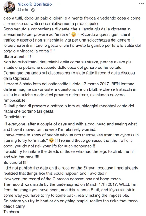 'Ik maak me zorgen, want ik heb meegekregen dat er mensen zijn die mijn afdaling proberen na te doen', aldus Bonifazio, die zijn afzink zelf bewust niet op Strava zette. Hij haalde echter snelheden tot 85 kilometer per uur in de bochtige afzink, zo bewees de motor die hem op die bewuste Milaan-Sanremo-dag niet bij kon houden. Ook straf: naar eigen zeggen reed hij de Cipressa in 2017 nóg harder omlaag.