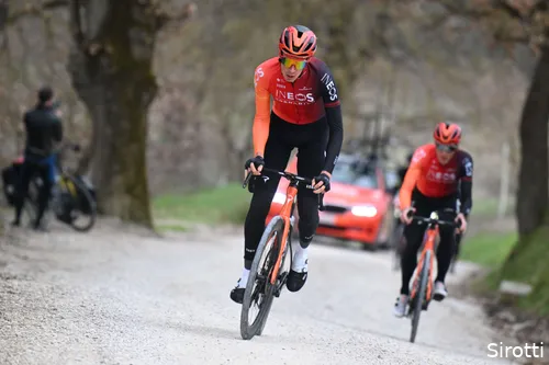 Titelverdediger Tom Pidcock gooit een bommetje. Ploegmaat Michal Kwiatkowski, eveneens tweevoudig winnaar, volgt.