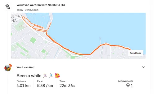 Van Aert verblijft sinds enkele dagen in Dénia, Spanje. Daar ging hij dinsdag fietsen met Tijmen Graat en Fem van Empel, om vervolgens te gaan hardlopen met zijn vrouw Sara. Na een dag vol sport stokte de teller voor Van Aert op 127 kilometer fietsen en vier kilometer lopen, terwijl Sara er nog twee kilometer bij plakte met de loopschoenen aan.
