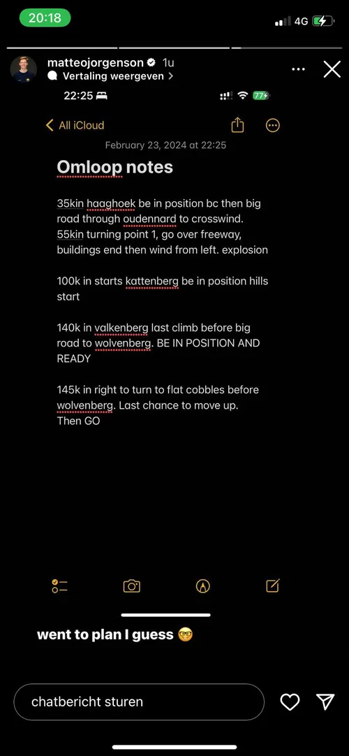 Matteo Jorgenson wel. De Amerikaan bleek in zijn eerste twee koersen voor de Nederlandse formatie cruciaal in het opzetten van de beslissende moves, waarmee hij ook direct het respect won van veel van zijn ploeggenoten. Op social media deelde hij enkele interessante notities vanuit het teamplan van de Nederlandse ploeg, waar