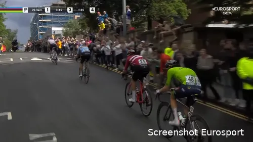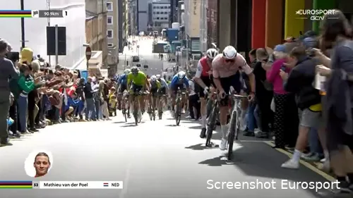 Het kaf is inmiddels van het koren gescheiden en iedere topper heeft al wel een aanval gedaan, inclusief Tadej Pogacar en Wout van Aert. Van der Poel is zelf ondertussen ternauwernood ontsnapt aan een crash met Matteo Trentin, nadat de Italiaan op scherprechter Montrose Street een nadar raakt en op acrobatische wijze over de kop vliegt.