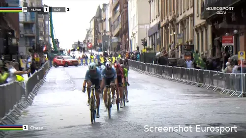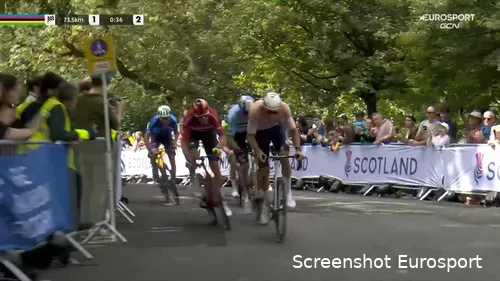 We zijn inmiddels op het circuit van Glasgow aanbeland, waar de Denen direct druk op de ketel zetten. Met hardrijders als Magnus Cort, Mikkel Bjerg en Søren Kragh Andersen trekken zij het peloton volledig op een lint, waardoor het direct duidelijk is wat voor koers het gaat worden in de Schotse stad: een afvallingsrace tot aan de meet.