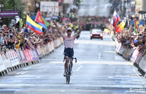 Op 73 kilometer van de meet besluit Van der Poel in Kelvingrove Park een tweede bom te droppen, waar we eigenlijk al direct zien wie de beste mannen in koers zijn. Van Aert, Pogacar, Pedersen en Alberto Bettiol volgen, wat eigenlijk voor de rest van de koers de mannen blijken om in de gaten te houden. De groep-Evenepoel vindt later nog wel de aansluiting, maar weet op dat moment al hoe laat het is. Met dank aan Mathieu.