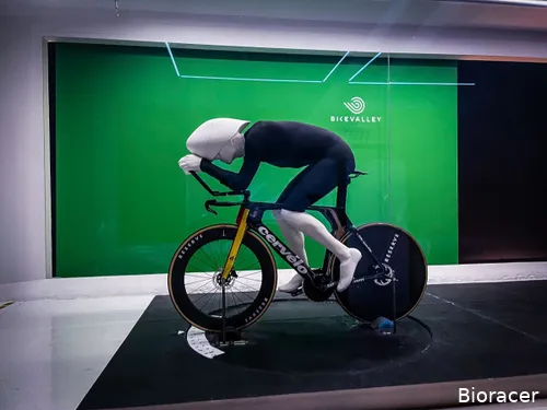 'De ‘most-tested’-kledingfabrikant is daarnaast ook founding partner van de Bike Valley-windtunnel waar de drie poppen volledig tot hun recht komen', vervolgt het merk. 'Het uitvoeren van windtunneltest met zulke poppen biedt significante voordelen ten opzichte van tests met de renners zelf. Er kunnen meer tests worden uitgevoerd en de positie van de pop op de fiets blijft constant, wat leidt tot nauwkeurigere resultaten. Bioracer heeft in het verleden al succesvol getest met een tijdritpop van Tony Martin en een schaatspop van Bart Swings.'