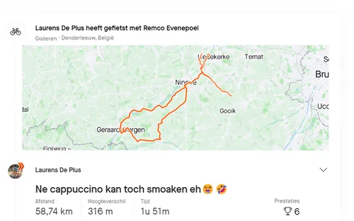 Beide mannen rijden waarschijnlijk de Tour de France vanaf eind juni. De Plus staat op de longlist namens zijn Britse werkgever, voor Evenepoel is de Tour het absolute hoofddoel van 2024. Na een flinke hoogtestage trok de Aerokogel van Schepdaal terug naar België, voor even wat ontspanning. 'Ne cappuccino kan toch smoaken eh', kopte De Plus met enkele veelzeggende emoji's boven de activiteit, die ongeveer twee uur duurde. Evenepoel sloot zich aan bij de gezelligheid: 'Veel geklets, weinig gefiets.' Aanstaande zondag vervolgt de Belgisch kampioen zijn wedstrijdkalender in het Criterium du Dauhpiné.