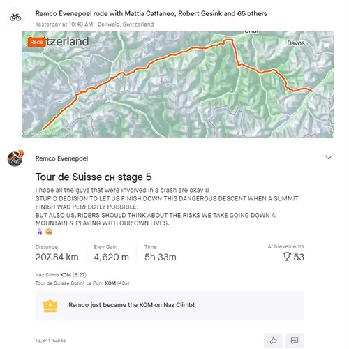Strava-file van de rit van donderdag maakt Evenepoel nog een statement. 'Ik hoop dat alle jongens die betrokken waren bij de valpartijen oké zijn. Het is een stomme keuze om ons te laten finishen na zo'n zware afdaling, waar een finish bergop perfect mogelijk was geweest.'