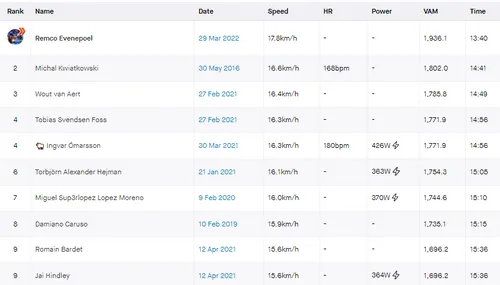 Jumbo-Visma-renners Wout van Aert en Tobias Foss deden er in februari 2021 nog iets langer over. Evenepoel is dus duidelijk vorderingen aan het maken in het steile klimwerk, waar hij dit voorjaar in Valencia en Tirreno-Adriatico moeite mee had. De Belg heeft een groot doel gemaakt van de Ardennenklassiekers, waar hij samen met Julian Alaphilippe de kopman van zal zijn van