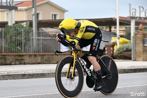 Jonas Vingegaard aan het vertrek, die we na zijn Tourtijdrit van vorig jaar voor elke tijdrit naar voren blijven schuiven. Ook Sepp Kuss en Ben Tulett zijn van de partij.