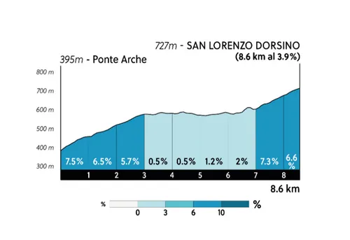 We starten en finishen in het prachtige bergplaatsje San Lorenzo Dorsino. Er is een mooie lus van ruim 145 kilometer uitgelegd, waarin we twee gecategoriseerde beklimmingen tegenkomen. De Campo Carlo Magno is van eerste categorie, al is dat meer vanwege z'n lengte van 14,5 kilometer, dan vanwege z'n gemiddelde stijgingspercentage van 6,2 procent. Na een lange afdaling en fase in dalende lijn knallen we de Passo del Durone op, met 6,3 kilometer een stuk korter, maar aan 7,8 procent gemiddeld ook steiler.