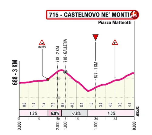 Wat dat inhoudt? De eerste vier kilometer gaan direct aan 9,4 procent, waarna we vijf kilometer aan 8,5 procent krijgen. Vervolgens daalt het even, wat het gemiddelde stijgingspercentage uiteraard omlaag brengt, en loopt het vervolgens drie kilometer aan 12,4 (!) procent de lucht in, waarna het in de laatste kilometer tot de top afvlakt tot 5,3 procent. Leuk detail: Antonio Tiberi en Damiano Caruso reden in aanloop naar de Giro de KOM op deze klim.