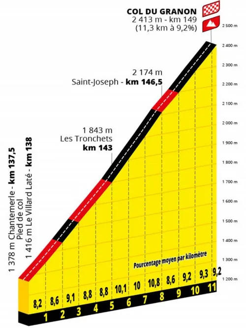Tour de France, maar de cijfers liegen er niet om: 11,3 kilometer aan een gemiddeld stijgingspercentage van 9,2 procent. In de laatste vijf kilometer zakt het daarnaast niet meer onder de negen procent, en wederom gaan we de hoogte in. De Granon ligt op 2413 meter hoogte, dus hier gaan we hoe dan ook spektakel krijgen.