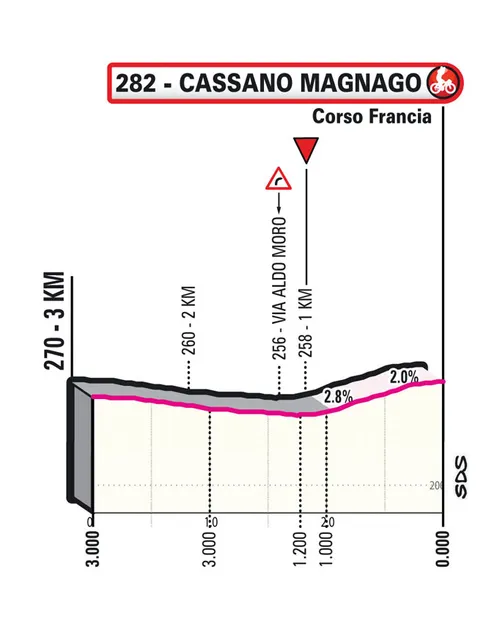 De afdaling is maar liefst veertig kilometer lang, waarna we vanuit Villadossola koers zetten richting aankomstplaats Cassano Magnago. Een geluk voor de renners is dat de wind bijna de hele rit in de rug zal blazen, terwijl het naar verwachting - opnieuw - zal regenen.