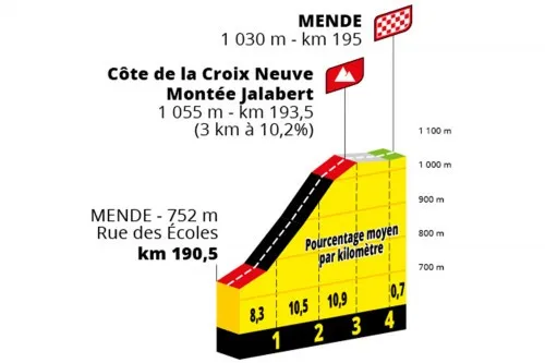 Na de afdaling ligt er nog één hindernis klaar. Gaan de klassementsrenners daar strijden voor de ritzege? Of blijft er iemand vooruit? Het wordt steil, drie kilometer aan 10,2 procent is net even iets langer dan een muur á la de Muur van Hoei. De Côte de la Croix neuve Montée Jalabert begin met percentages rond de acht procent nog prima, maar daarna is het twee kilometer aan dik tien procent. Op de top vlakt het af, wie maakt het daar af in een sprintje?
