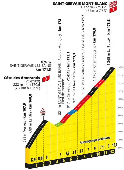 De laatste vijftien kilometer van de rit kunnen we het beste bestempelen als een tweetrapsraket: de Cote des Amerands (2,7 kilometer aan 10,9 procent) is voor de TV-kijkers dan een lekker voorgerecht, waarna we via een ultrakort afdalinkje beginnen aan het hoofdgerecht van de dag: de beklimming van Le Bettex, die ons naar de Mont Blanc brengt. Deze begint nog vrij timide, maar tussen drie en vier kilometer van de meet lopen de percentages toch fel op. Aan het einde van zo'n rit is dat hoe dan ook voer voor spektakel!