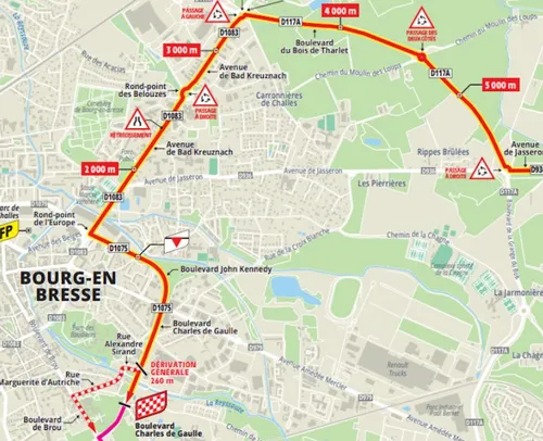 De laatste kilometers zijn mooi te noemen. Tussen zes en twee kilometer van de aankomst wachten er wel nog wat rotondes en een versmalling, maar op een bocht op 1500 meter en een brede, flauwe bocht onder het vod na is het allemaal rechttoe rechtaan. Finishen doen we op de brede Boulevard Charles de Gaulle in Bourg-en-Bresse, uiteraard vernoemd naar de beroemde Fransman uit de Tweede Wereldoorlog. Hier lopen de laatste honderden meters nog heel licht bergop, aan zo'n twee procent.