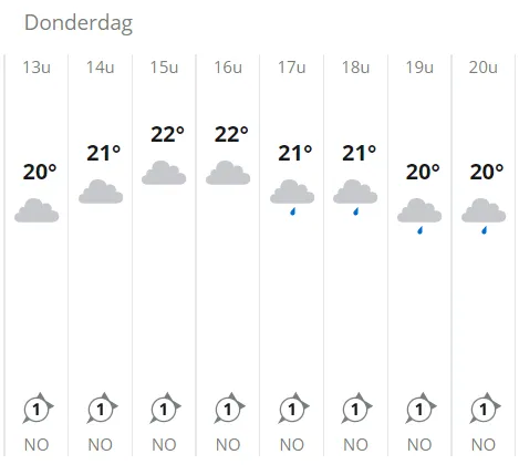 Net als woensdag geen snikhete dag voor het peloton, want in Asturië is het bewolkt met kans op regen. In het plaatsje Pola de Lena, dat wordt gepasseerd tussen de Altu la Séga o del Cordal en de slotklim Altu d'El Gamoniteiru, is het nog wel boven de twintig graden Celsius, maar richting het eind van de middag bestaat de kans op regen.