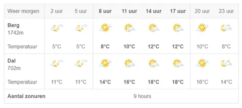 Waar de renners in de zeventiende etappe eindelijk een droge, warme etappe in de bergen hadden, lijkt dat met de aankomst op Alpe di Mera opnieuw het geval. We starten met een zonnetje en dik 20 graden en de renners doen maar beter zonnebrand op voor de eerste koersuurtjes. Eenmaal in de bergen, kan het allemaal wat koeler worden, maar we zien nergens echt iets over veel neerslag. Op de berg wordt 12 graden en een zonnetje voorspeld, in het dal blijft het rond de 20 graden.
