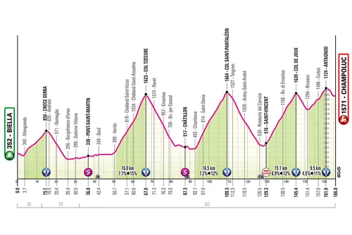 welke monsterlijk te noemen is. Tussen startplaats Biella en de aankomst in Champoluc moeten er vijf zware cols overwonnen worden, waarbij de besten hoe dan ook boven zullen komen drijven.