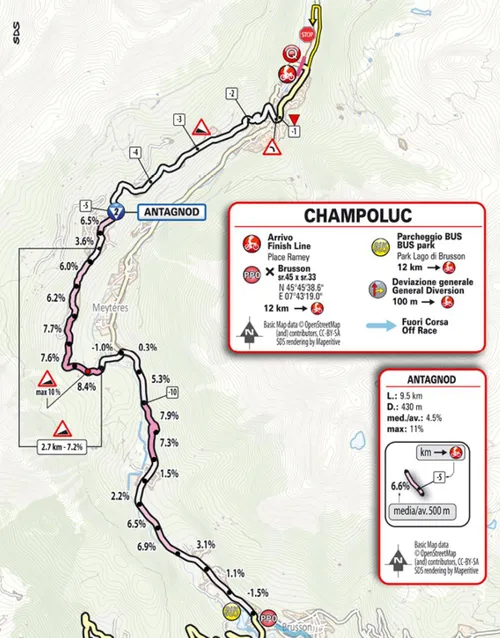 Temeer omdat er slechts een korte afdaling volgt, vooraleer de Antagnod-klim (9,5 km a 4,5%) richting de aankomst in Champoluc in zicht komt. Deze is van een onregelmatig soort, met twee steile kilometers van ongeveer 7,5 procent in het midden. Op de top is het nog vijf kilometer dalen tot in Champoluc, waar nog een technische afdaling met de nodige bochten en ook kasseien ligt.