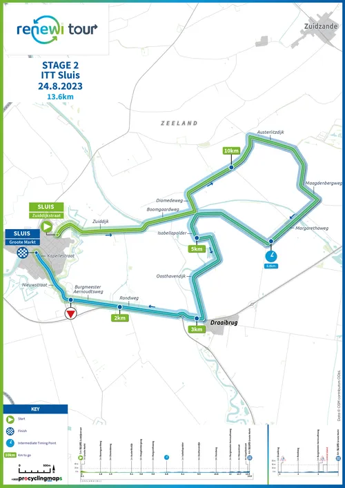 De tijdrit kent niet al te veel technische hindernissen, dus het zal er voornamelijk om draaien wie de hoogste wattages kan duwen door het Zeeuwse land, waar na 6,8 kilometer een tussenpunt gelegen is. Op circa vijf kilometer van de meet zit nog wel een technische passage, waar de renners - net als in de andere bochten - dienen op te passen door de kans op regen.