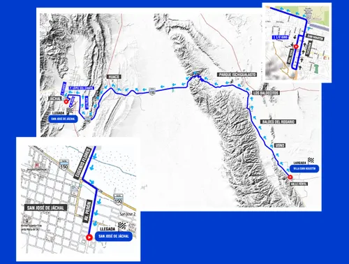 Vuelta a San Juan is een beetje atypisch, iets wat we in Europa niet zo snel voor de kiezen krijgen. Vanuit de startplaats Villa San Agustín gaat het peloton tachtig kilometer lang heel licht bergop richting Ruta 150, om vervolgens af te dalen en het restant van de rit opnieuw vals plat af te werken.