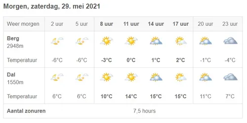 De etappe kent de officiële start om 12.30 uur, met de finish rond 17.15 uur. Aan het weer zal het in deze laatste bergetappe niet liggen. Bij de start in Verbania is het al dik boven de twintig graden, met amper wind en een lekker zonnetje. In de middag stijgen de temperaturen tot wel 26 graden, al zal het op de hoge bergpassen uiteraard wat afkoelen. Richting de finale blijft het zonnetje aanwezig rond de Italiaans/Zwitserse grens.