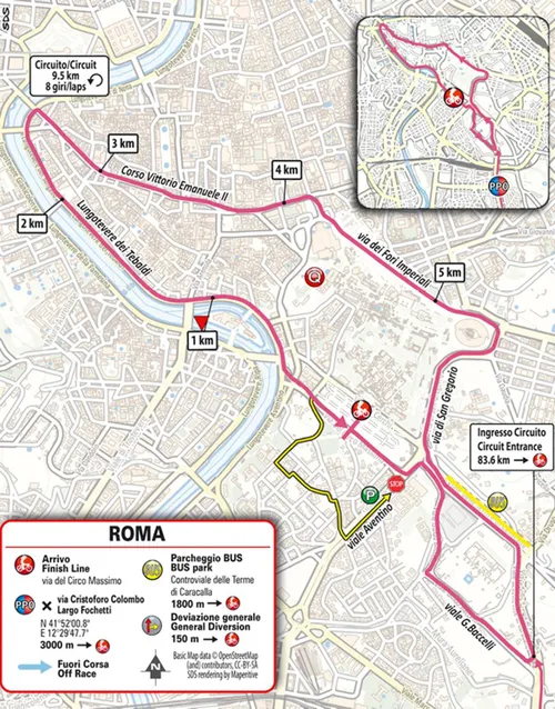Na 67,5 kilometer komen we voor het eerst langs de finishlijn, alvorens er nog acht plaatselijke rondjes van een kleine 10 kilometer worden afgewerkt. Dat is een rondje van draaien en keren, oud-Italiaanse stenen afgewisseld met wat asfalt en uiteindelijk de kans om te sprinten op de Via del Circo Massimo. De winnaar mag, net als de winnaars van alle truien, het podium op voor het Colosseum.