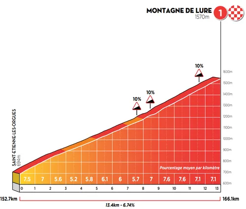 Toch begint de rit pas écht na 151 kilometer, als de flanken van de slotklim opdoemen. De Montagne de Lure is in totaal 13,4 kilometer lang aan een gemiddeld stijgingspercentage van 6,7 procent. De klim staat bekend om haar regelmaat, het zou net zo goed een exponentiële lijn in een grafiek kunnen zijn. Het tweede deel is wel iets steiler dan deel één, met stukken die oplopen tot de tien á elf procent.
