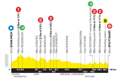 Daarna is het toch wel even over met de pret. Echt vlak wordt het niet zo snel in Duitsland, maar tussen kilometer 75 en 150 hebben we weinig noemenswaardige hindernissen. Pas bij het betreden van de lokale ronde in Stuttgart wordt het weer heuvelachtig, met de Herdweg (1,4 kilometer aan 7,1 procent) als allesbeslissende factor. Deze beklimming moeten de coureurs driemaal passeren, een laatste keer op zes kilometer van de meet.